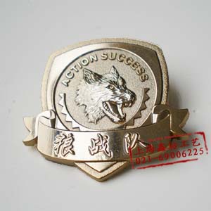 此徽章为上海行动成功国际教育集团(action success)委托我公司设计制作的活动胸牌,尺寸为:40mm*38mm.立体浮雕设计.盾形造型内部为一狼头,惟妙惟肖,非常逼真.设计稿如下: