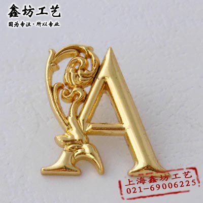 【产品名称】A字镂空镀金徽章 房地产商开发商logo徽章鑫坊工艺